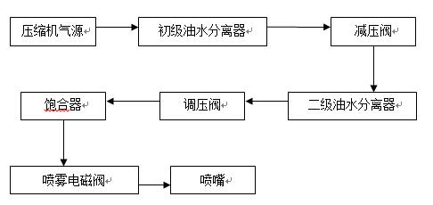 1.2.為了保障進入噴咀的空氣為潔凈帶濕度的熱空氣,需將壓縮機產生的氣體進行油水分離,油水分離過濾器采用預過濾及精過濾、除油過濾三級過濾方式,高分子化合材料制成的濾芯有效地去除壓縮空氣中的油、水及埃粒子。放在進入飽和器前的位置,力求做到盡最大的能力除油污。